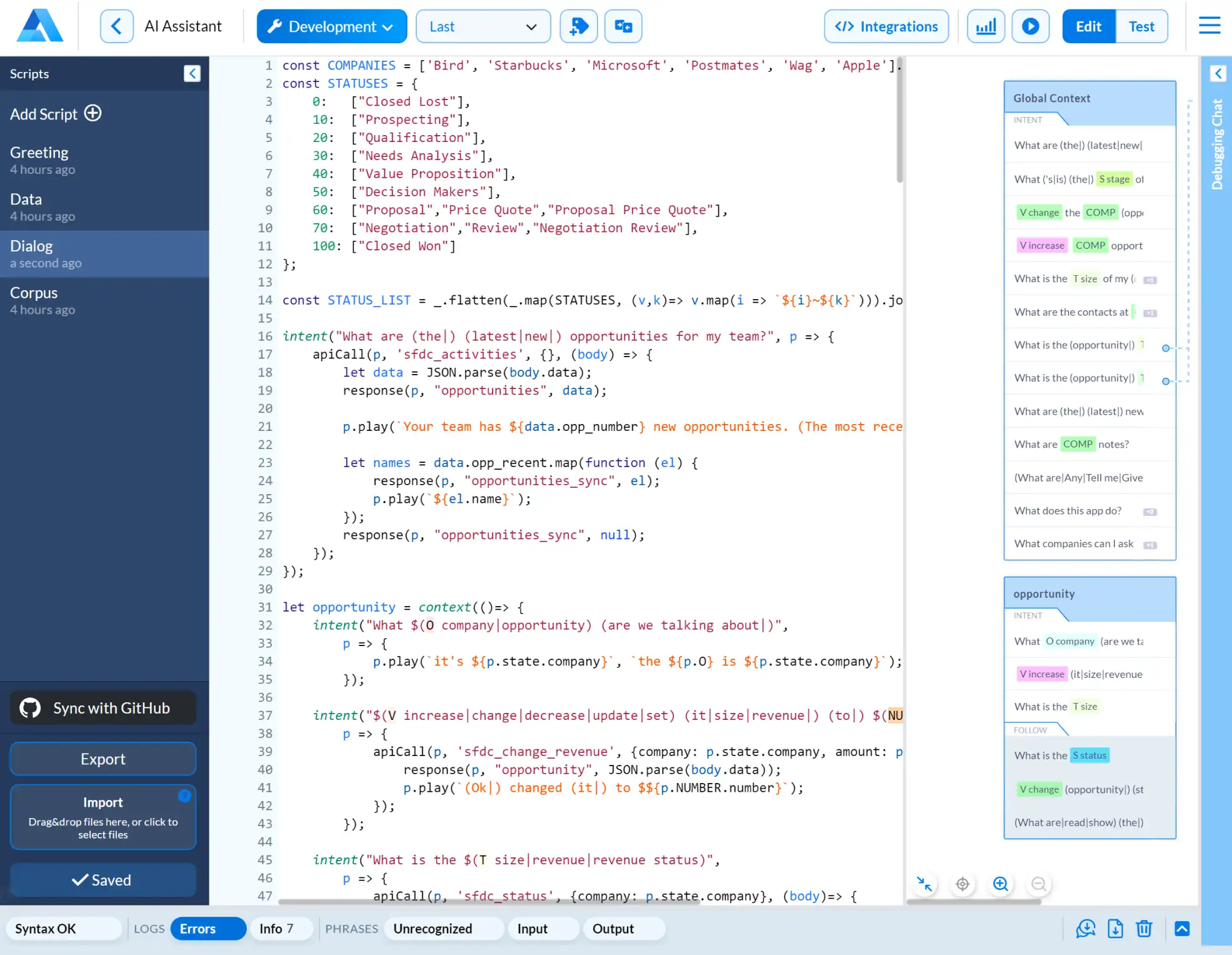 - Review Alan AI logs for problems, input, output and unhandled phrases